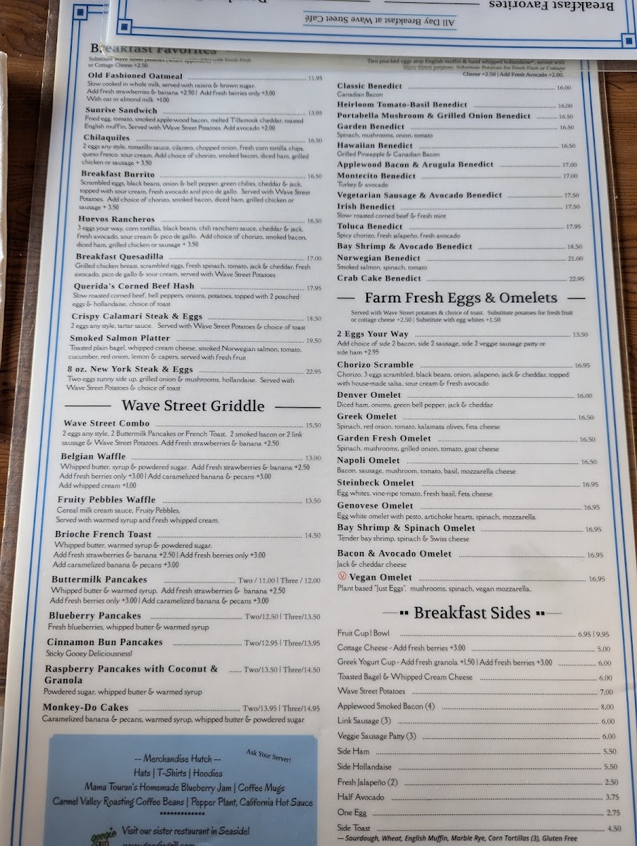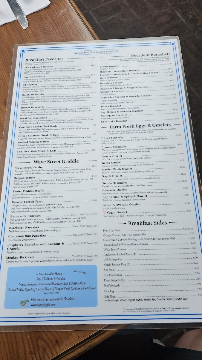 Welcome to Wave Street Cafe, a breakfast haven located at 550 Wave St, Monterey, CA. Known for its scenic ocean views, this café offers a delectable all-day menu that caters to diverse tastes. Guests can indulge in Jack's Burger with its classic toppings, or enjoy the rich flavors of the Bacon & Tillamook Cheddar Burger. The griddle section shines brightly with options like Belgian Waffles and MonkeyDo Cakes, ensuring a sweet start to your day.